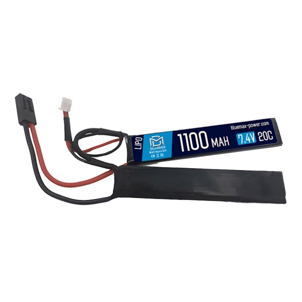 BlueMAX 7.4V LiPo 1100mAh 20C — идеальный аккумулятор для страйкбольных приводов. Этот литий-полимерный аккумулятор подходит для оружия с электрическим приводом. Емкость составляет 1100 миллиампер-часов, а выходное напряжение — 7.4 вольта.