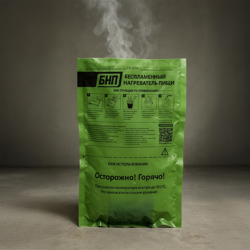 Портативный нагреватель для пищи без огня и электричества. Предназначен для разогрева консервов и герметичных упаковок в любых условиях — дождь, снег, ветер. Идеален для военных, туристов, охотников, спасателей и всех, кто в пути.