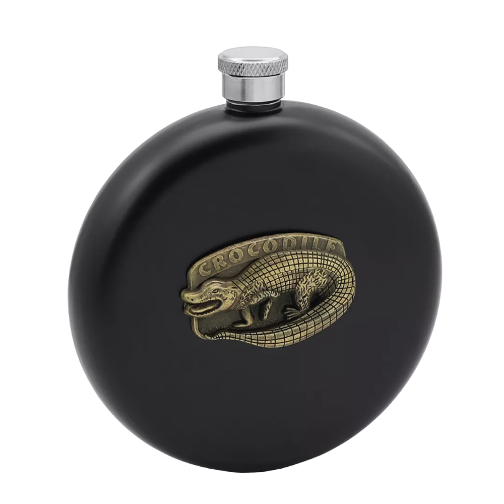 Карманная фляга черного цвета из пищевой нержавеющей стали для спиртных напитков или воды емкостью 220 мл. Фляга декорирована барельефом с изображением крокодила. Благодаря круглой форме фляга удобно помешается во внутренний карман одежды и не выделяется при ношении.