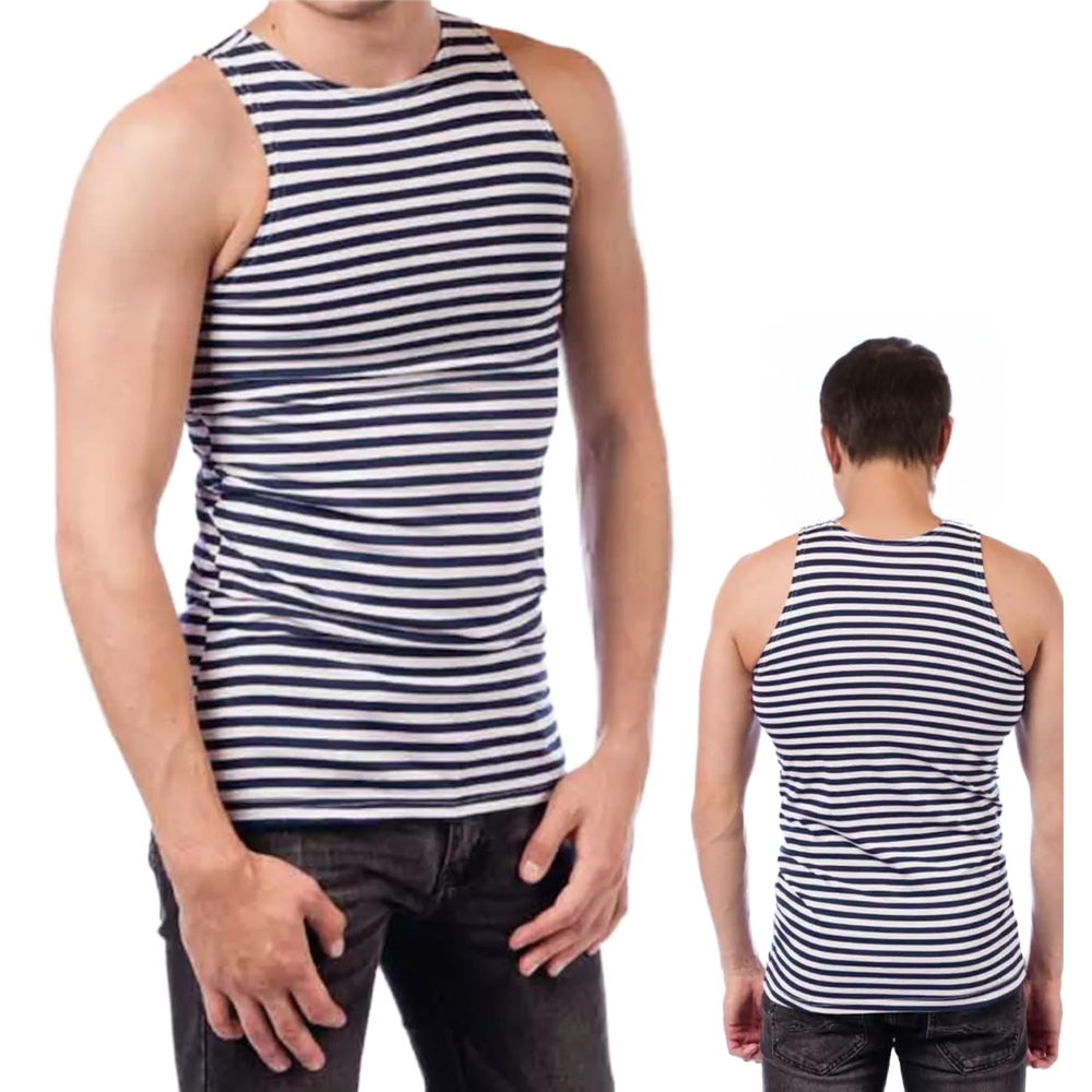 Майка изготовлена из хлопкового трикотажного полотна собственного производства. Полоска вязаная из цветной нити есть с обеих сторон полотна.