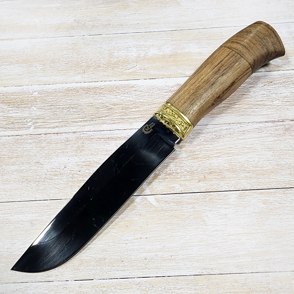 Нож Путник сделанный вручную мастерами кузницы Сёмина из города Ворсма. При ковке клинка использовалась сталь 65х13, твердость которой составляет 55 - 57 HRC. Для изготовления рукояти используется литье латунь, ценные породы дерева.