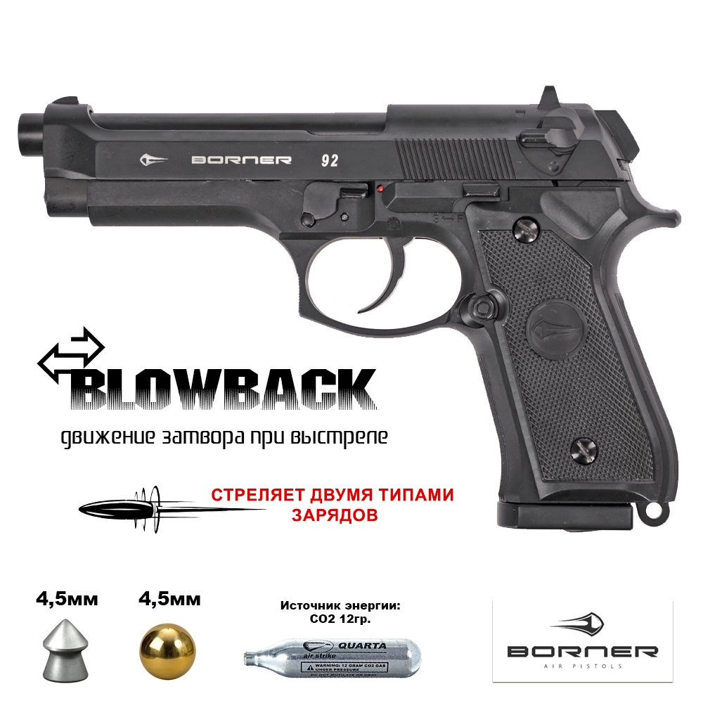 Пистолет пневматический Borner 92 Blowback (Beretta) кал.4,5мм