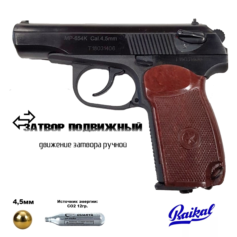 Это пневматический аналог пистолета Макарова с рабочей частью из оружейной стали, бакелитовой рукоятью и фигурной скобой. Ствол нарезной, система толкателя газобаллонная, винт поджима скрыт. Разборка та же, что у боевого аналога. Пневматический пистолет МР-654К-32 (ПМ, Макарова) стреляет шариками ВВ (калибр 4,5 мм). В собранном состоянии его вес не превышает 730 г.