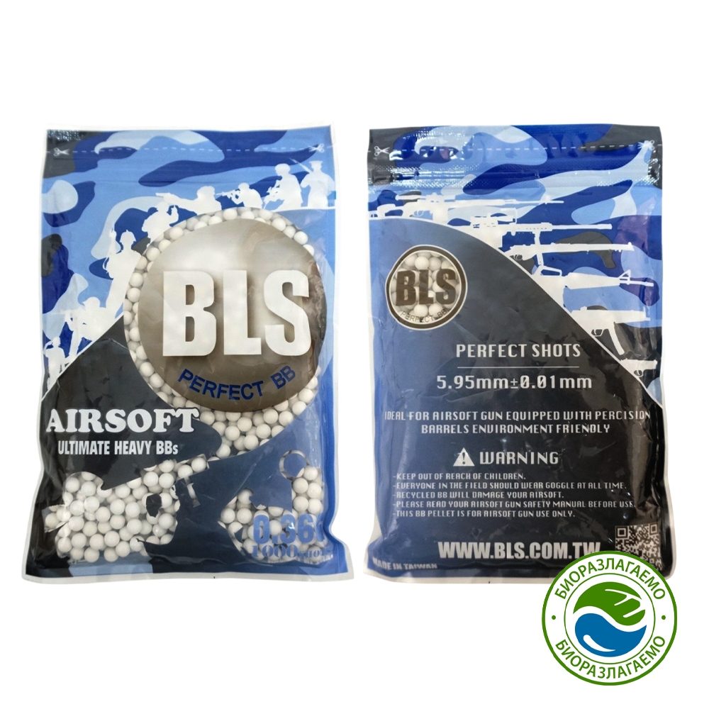 Пластиковые качественные шарики калибром 6 мм BLS Ultimate Heavy весом 0,36 граммов предназначены для стрельбы из страйкбольных пистолетов и винтовок. В упаковке примерно 1000 штук. Диаметр 5,95 мм, погрешность в диаметре этих шариков составляет всего 0,01 мм. Биоразлагаемые (BIO).