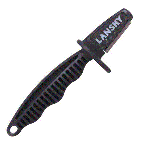 Оно представляет собой профилированную рукоятку с защитным щитком и рабочую поверхность из карбида вольфрама. Рукоятка за счет своей конфигурации надежно лежит в руке, а защитный щиток предохранит пальцы от пореза, если точилка соскочит с клинка.