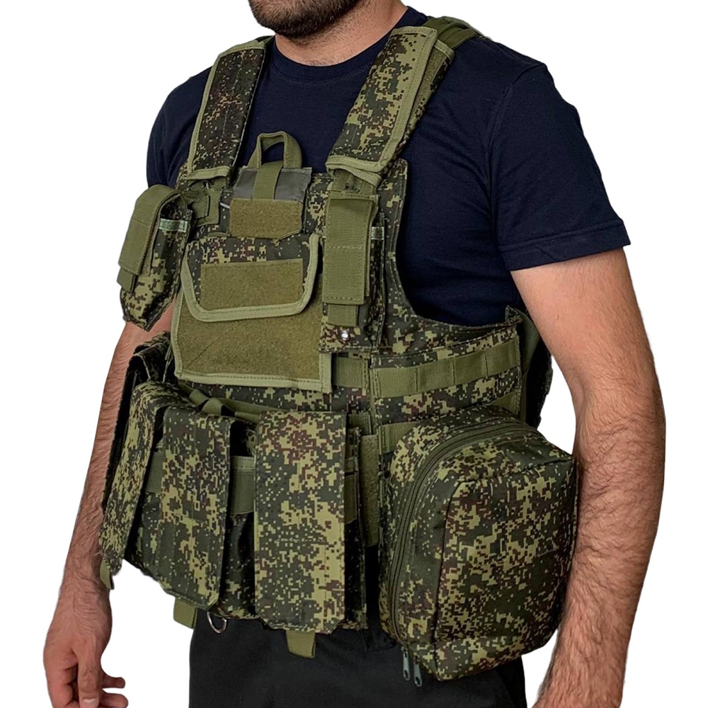 Прочный и надежный разгрузочный жилет с комплектом подсумков. Жилет имеет прочную структуру (дополнительно усиленную стальным тросом), пошит из износостойкого нейлона прочностью 1000D. Имеются отсеки для установки бронепластин. Снаряжение жилета подсумками и другой амуницией осуществляется на базе системы MOLLE.