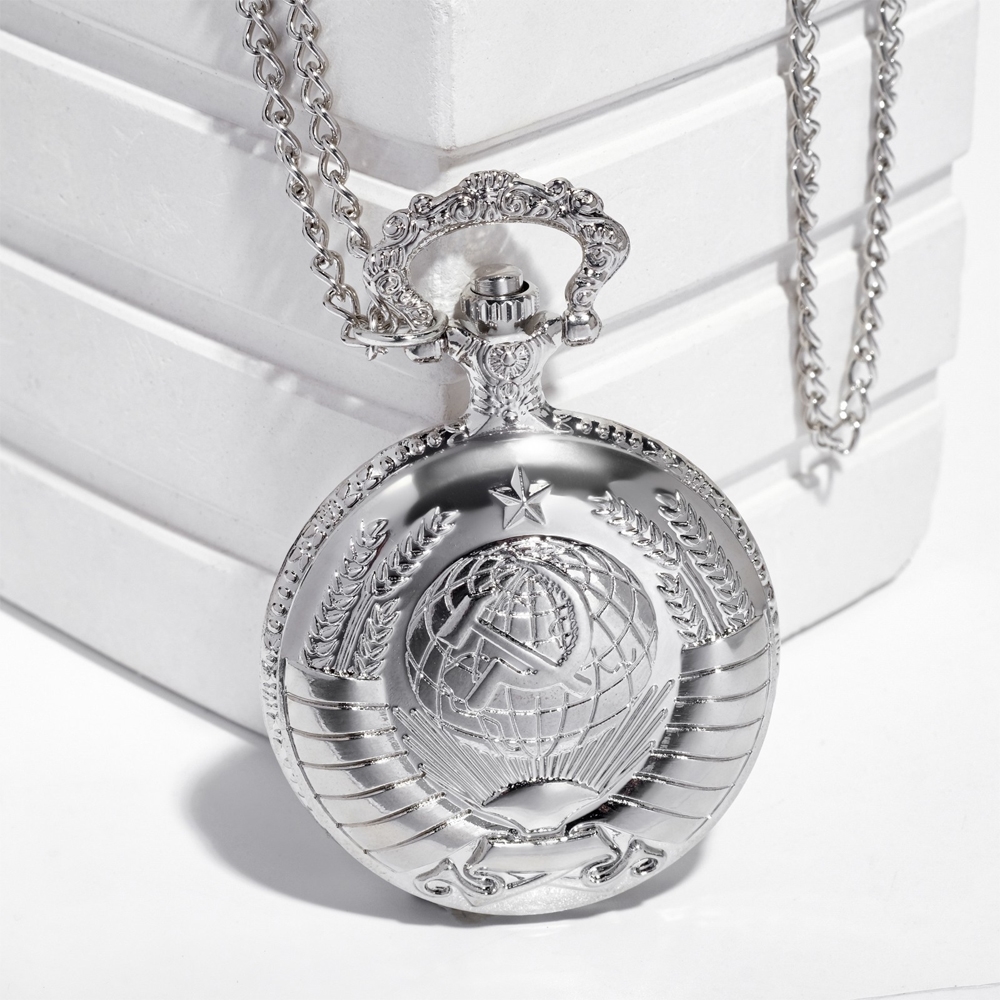 Часы карманные герб СССР на цепочке (кварцевые) (серебро)