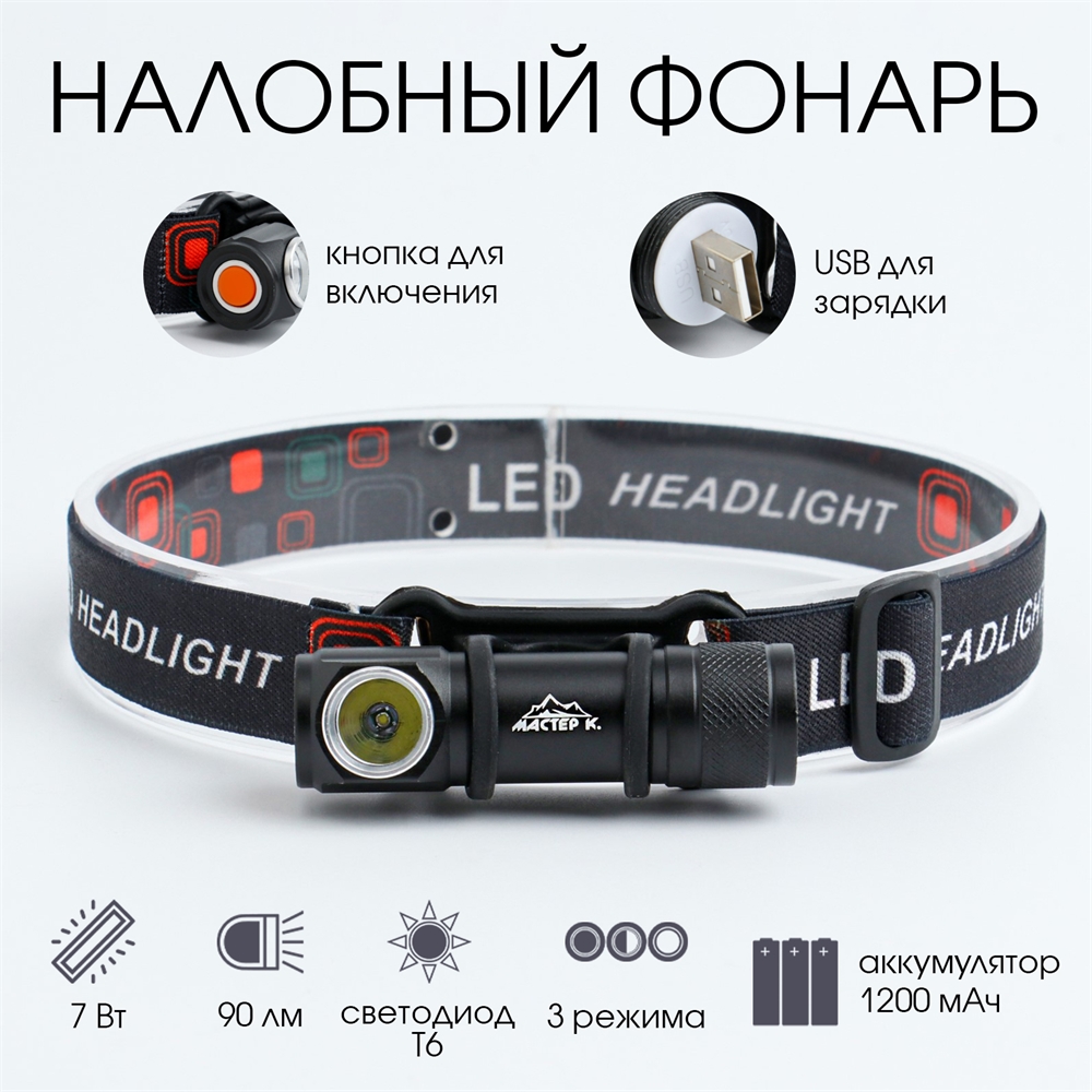 Фонарь налобный аккумуляторный "Мастер К" 7 Вт, 1200 мАч, 90 лм, 3 режима, 8 х 2.5 см, USB