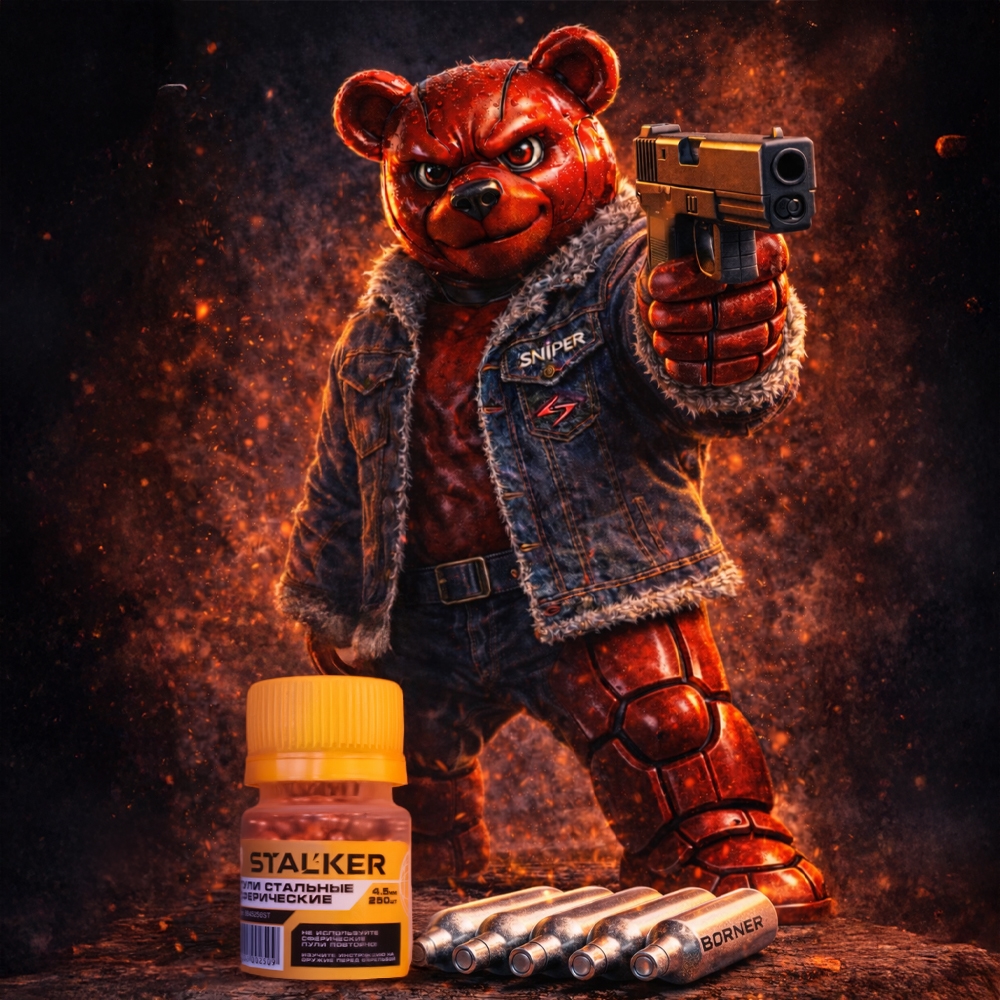 В наборе: 5 баллонов с CO2 по 12 граммов и 250 шариков калибра 4,5 мм.