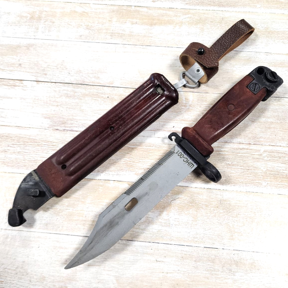 Штык нож к автомату Калашникова АК-47 полностью повторяет изделие, применявшееся армией СССР в 1967-1988 годах. Его клинок имеет одно лезвие, оснащенное зубчатыми насечками. Со стороны обуха кончик клинка слегка выгибается внутрь и становится двухлезвийным. Боевой армейский штык нож легко присоединяется к АК при помощи паза и специальной защелки с пружиной.