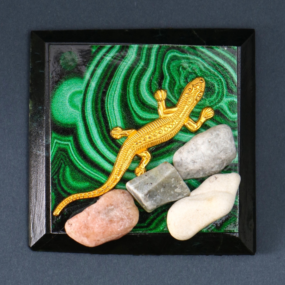 Сувенир магнит Пермь Ящерица с камнями (змеевик, корунд)