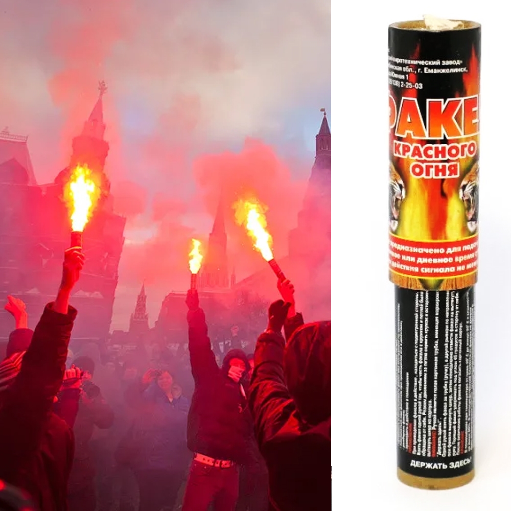 Выглядит это очень эффектно. Огневой факел состоит из картонного корпуса цилиндрической формы с воспламеняемым зарядом внутри. Зажигается путем выдергивания чеки, при горении держится на вытянутой руке.